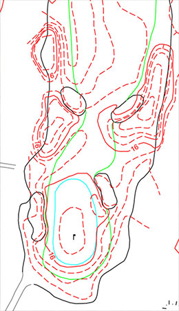 Karta uppgjord från ortofoto och punktmoln.Den slutliga kartan användes sedan i huvudsak till hjälp för att ”slopa” om banan. Kartmaterialet är sedan ett bra grundunderlag för att hålla reda på vattenledningar, avståndsmarkeringar, utslagsplatser och annat som hör till Golfbanan.